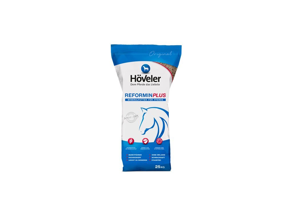 Reformin Plus podporuje látkovou výměnu, prevenci nedostatku živin a pomáhá udržet koně v dobrém zdravotním stavu a vitalitě. Výrobek neobsahuje melasu, je chutný a se snadným dávkováním díky vhodné struktuře pelet, které nezpůsobují prášení. Směs se doporučuje pro každodenní použití, když objemové krmivo neposkytuje dostatečné množství vitamínů a minerálních látek (např. Selen, měď, jód), a to zejména při intenzivním zatížení metabolismu zvířete (ať už jde o sportovní koně v tréninku či období březosti).