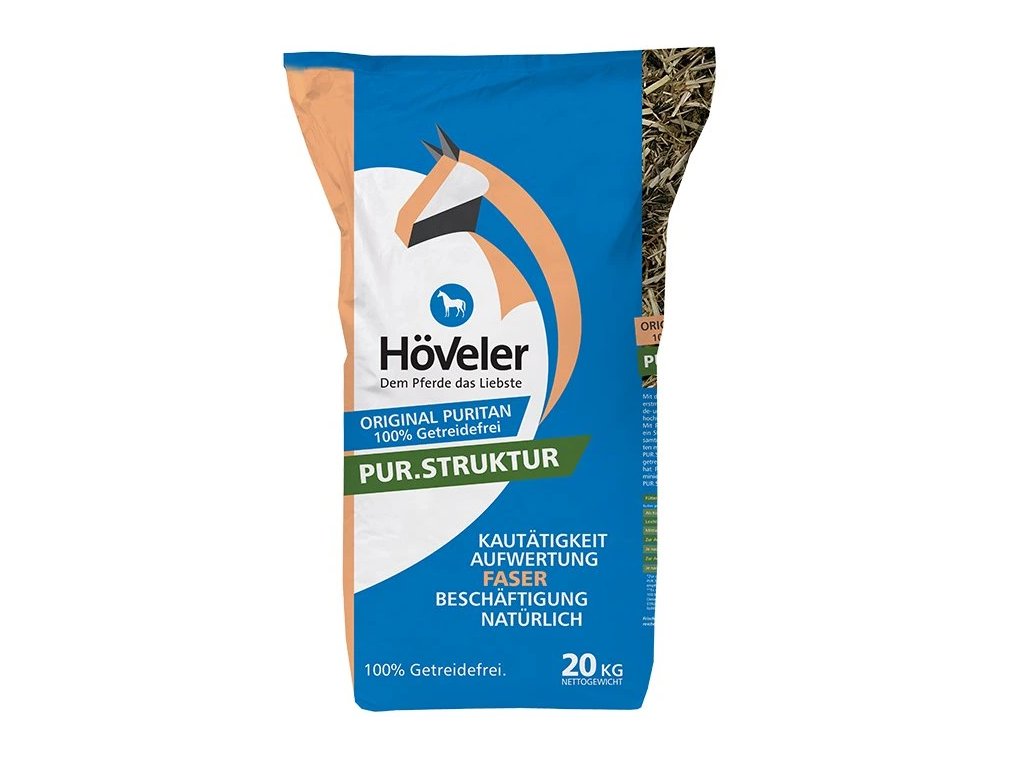Höveler Pur.Struktur, stejně jako celá PUR řada, neobsahuje žádné obiloviny a melasu. Jedná se o strukturované krmivo, které neobsahuje žádné další vitamíny a minerály, a proto jej lze krmit ke stávající krmné dávce jako další příděl vlákniny pro podporu žvýkání a slinění.